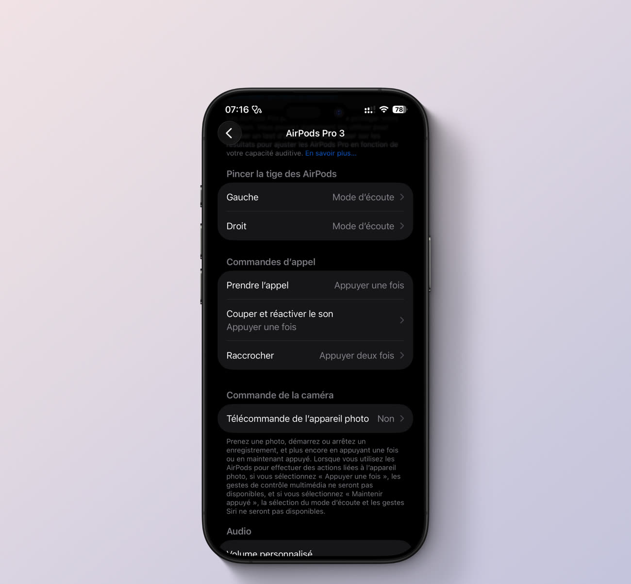 C'est ici que vous pouvez moduler l'expérience selon vos habitudes via les réglages de l'iPhone. Un appui prolongé sur la tige peut, au choix :