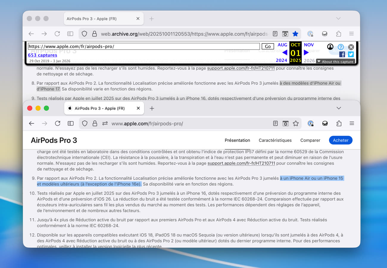 Cette mention était donc erronée. Quelques semaines après la sortie des AirPods Pro 3, Apple a discrètement corrigé ce propos. Dans les notes de bas de page, il est désormais indiqué que « la fonctionnalité de Localisation précise améliorée fonctionne avec les AirPods Pro 3 jumelés à un iPhone Air ou à un iPhone 15 et modèles ultérieurs (à l’exception de l’iPhone 16e) ». Autrement dit, tous les iPhone dotés d’une puce U2 peuvent en profiter, ce qui est bien plus logique.